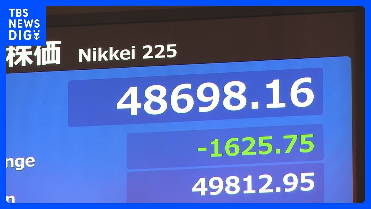 ▼きょうの東京株式市場で日経平均株価は午前は一時1200円安となりました。さらに、午後になって下げ幅を拡大。一時1600円の値下がりとなり、4万9000円台を割り込む場面もありました。