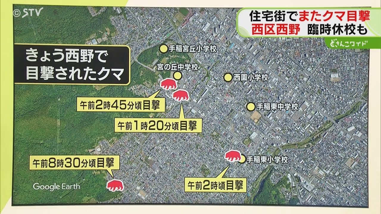 午前2時ごろには手稲東小学校に近い住宅の敷地内に入っていくクマが目撃されたほか、午前2時45分ごろにも目撃情報がありました。