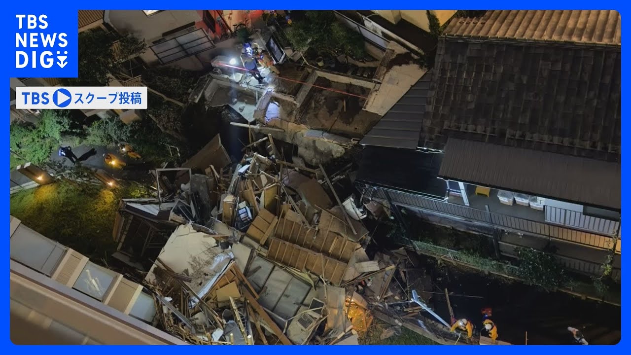 近くの住民が撮影した映像からは、住宅が向かいに建つマンション側に倒れ込んでいるような様子がうかがえます。白い粉じんが舞っているのも確認できます。