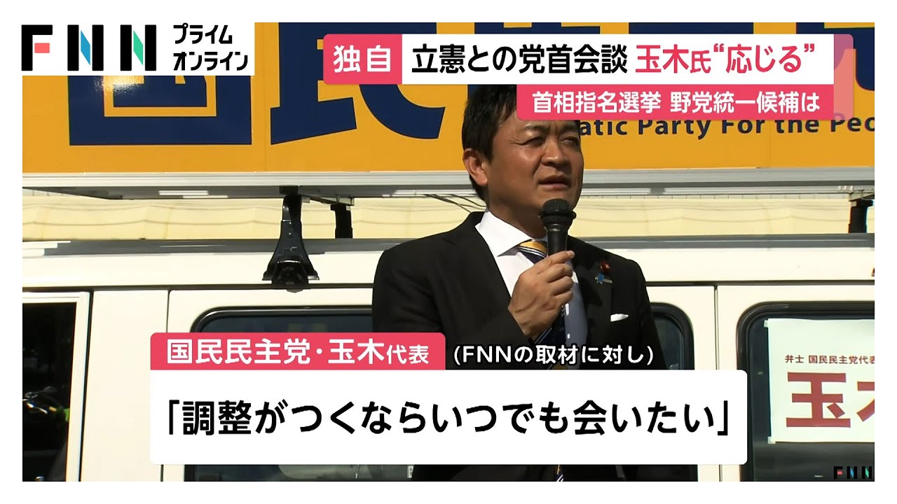 国民民主党の玉木代表は13日朝、FNNの単独取材に対し、首相指名選挙での野党統一候補の擁立を目指す立憲民主党が呼びかけている党首会談に応じる意向を表明しました。