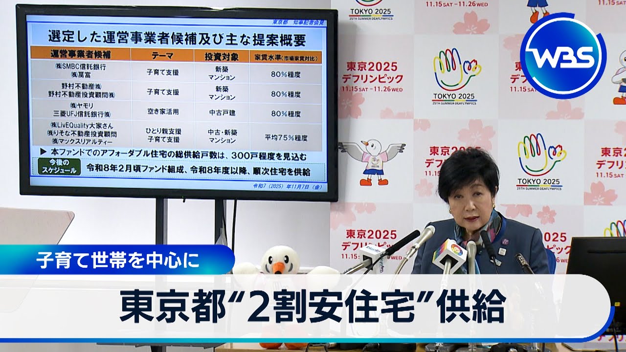 東京都の小池知事は7日、手頃な家賃で住める「アフォーダブル住宅」を2026年度以降におよそ300戸供給すると発表しました。都と野村不動産などが連携してファンドをつくり、総額200億円以上の資金でマンションや一戸建てを購入します。子育て世帯を中心に家賃は相場から2割ほど安く貸し出す考えです。