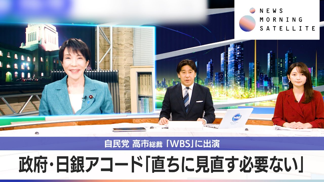 自民党の高市総裁は9日、テレビ東京のWBSに出演し、2%の物価安定目標に向けて、2013年に政府と日銀が発表した共同声明、いわゆる「アコード」について、「直ちに見直す必要はない」との認識を示しました。高市総裁はその上で、金融政策の手段を決めるのは日銀だとして、「私の立場で利上げそのものについて発言すべきではない」と強調しました。また一時、1ドル=153円まで円安ドル高になるなど円安基調が続いていることについては「行き過ぎた円安を誘発するつもりはない」と述べました。一方、赤字国債の発行をめぐっては、「財政健全化が必要ではないと言ったことは一度もない」と説明しました。さらに、連立協議が難航する公明党との関係をめぐっては、自公の連立が「基本中の基本」だとした上で、2回目の自公党首会談が10日開かれることを念頭に、「連立の合意が速やかにできるように話を聞きたい」と述べました。