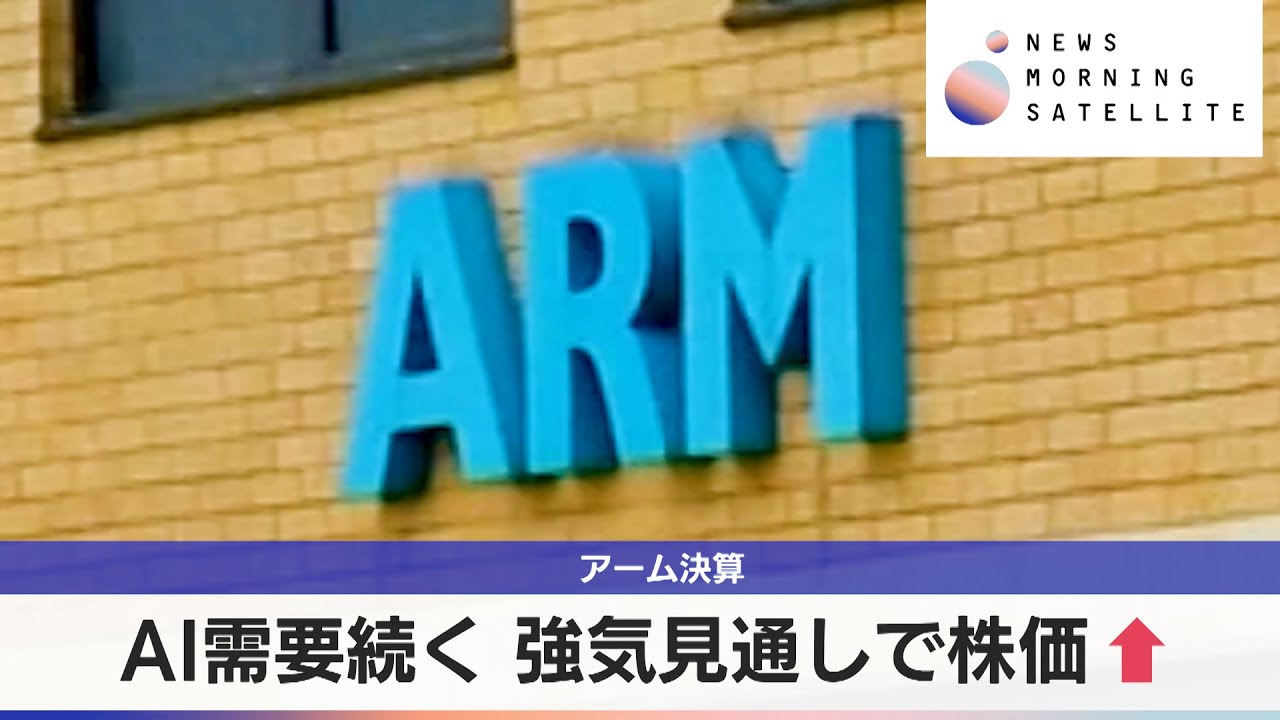 イギリスの半導体設計大手アームの7月から9月期の決算は売上高が1年前から34%、純利益も2倍以上にそれぞれ増加し、いずれも市場予想を上回りました。AI関連の需要を背景に設計図の販売で得られるライセンス収入が堅調でした。10月から12月期の売上高については12億2500万ドル前後と市場予想を上回る見通しを示しています。アームの株価は時間外で一時、10%近く上昇しました。